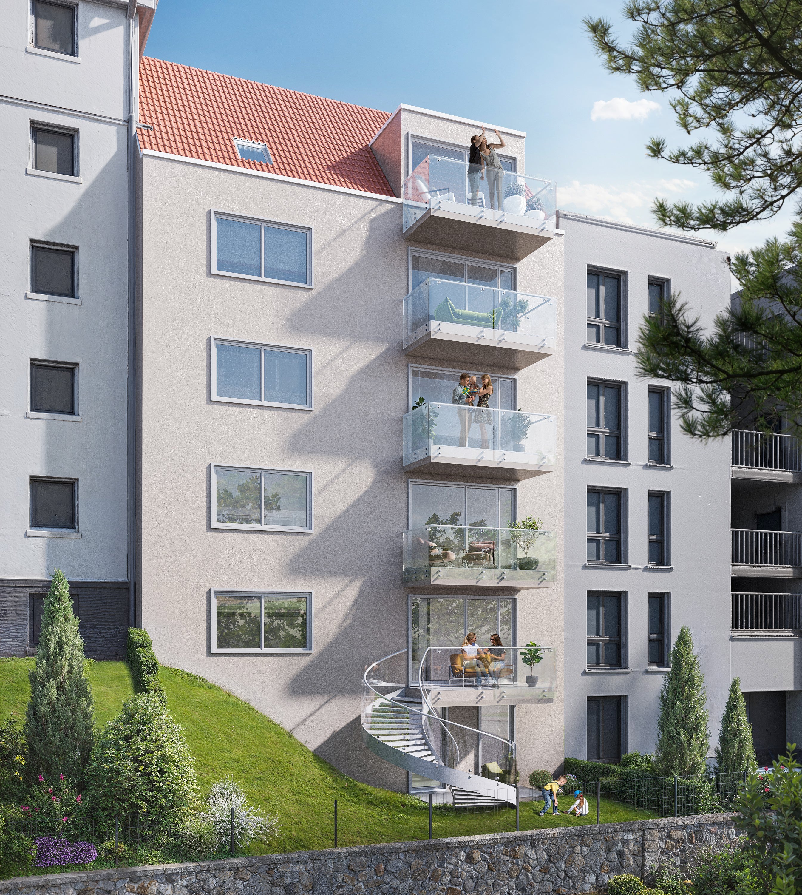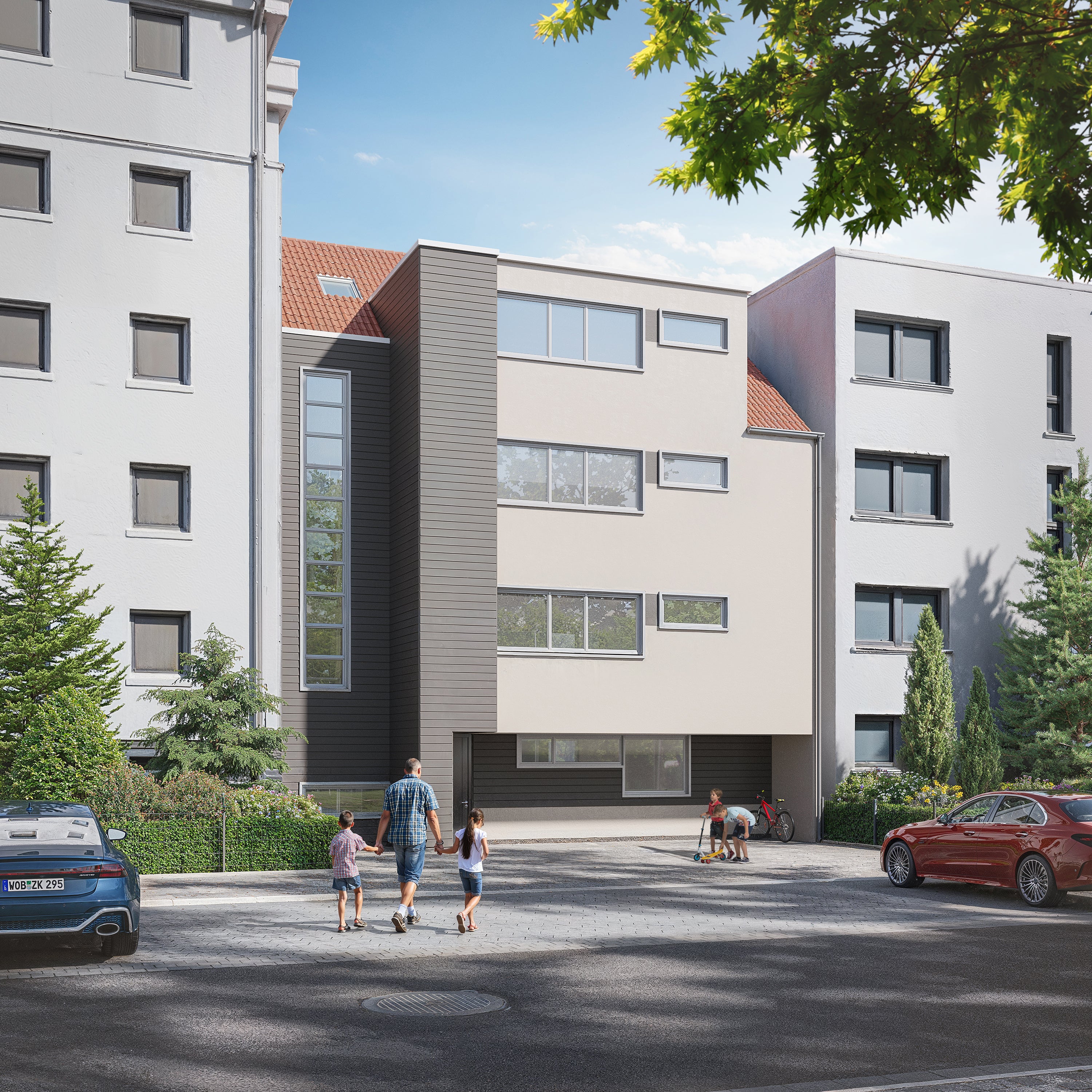 Resultat: Darstellung der realistischen Nebengebäude mit der Einbettung des geplanten Bauvorhabens. Ideale Zielgruppenansprache durch die Darstellung spielender Kinder vor dem Objekt.