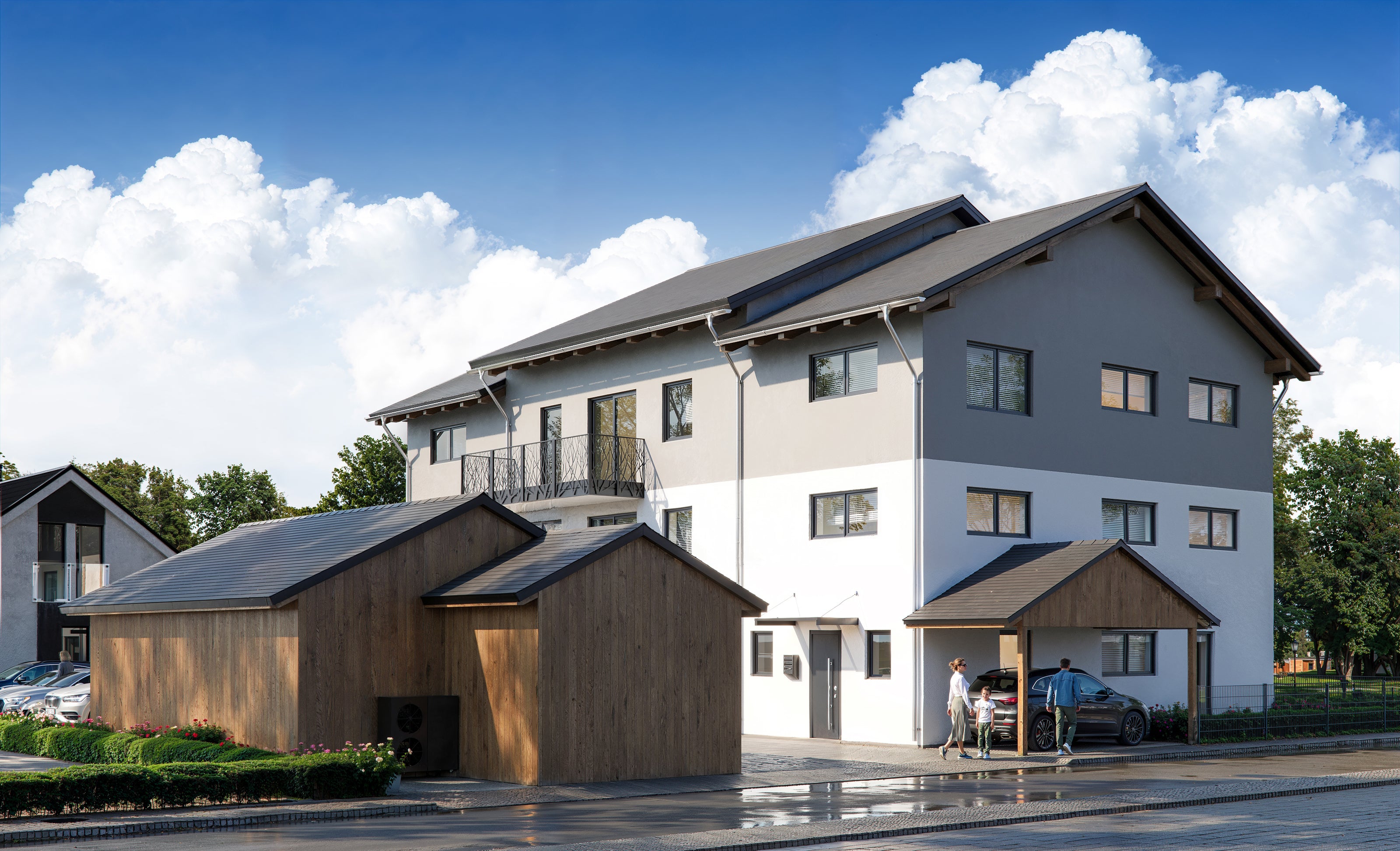 Gegebenheiten: Neubauvorhaben eines Mehrfamilienhauses mit 6 Wohneinheiten. Für die erfolgreiche Vermarktung wurden mehrere Außenansichten benötigt.